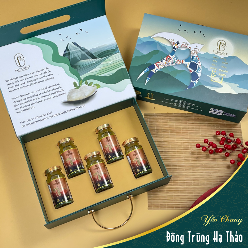 Hộp Lạc Hồng 5 Hũ Yến Chưng Thượng Hạng Đông Trùng Hạ Thảo 1380mg 150ml mang trong mình sự hòa quyện giữa vẻ đẹp chim yến Gia Lai và núi rừng Tây Nguyên hùng vĩ, mang lại giá trị dinh dưỡng tuyệt vời từ thiên nhiên.